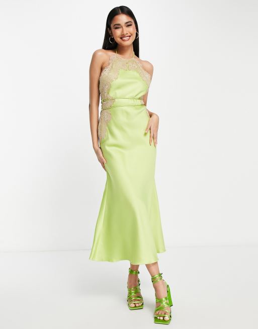 ASOS DESIGN – Grön midiklänning i satin med hög krage och spetsapplikation med smalt skärp i midjan