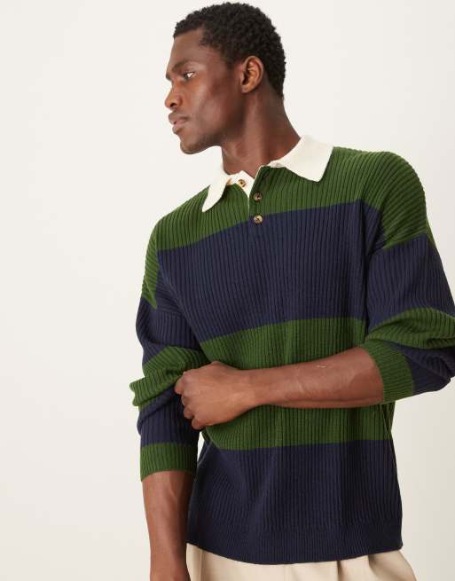 ASOS DESIGN – Grön och marinblå, randig, stickad, avslappnad rugbytröja
