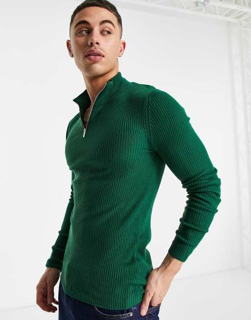 ASOS DESIGN – Grön ribbstickad tröja i muscle fit med dragkedja vid halsen
