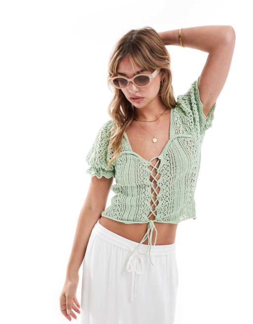 ASOS DESIGN – Grön, stickad topp med snörning och puffärmar