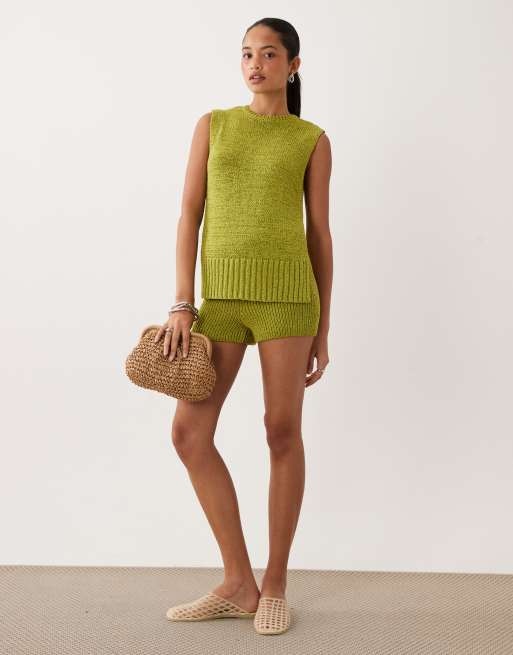 ASOS DESIGN – Grönt, stickat set i bandgarn med linne och shorts