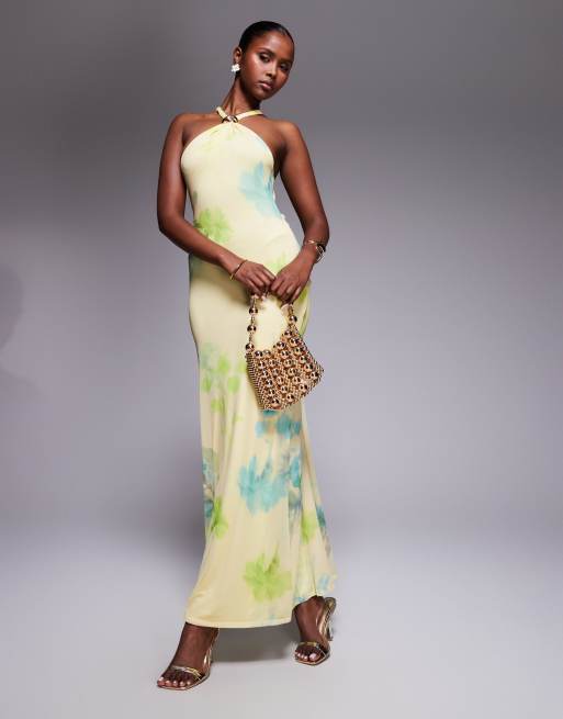 ASOS DESIGN – Gul, blommig maxiklänning i mesh med halterneck och snurrad detalj baktill