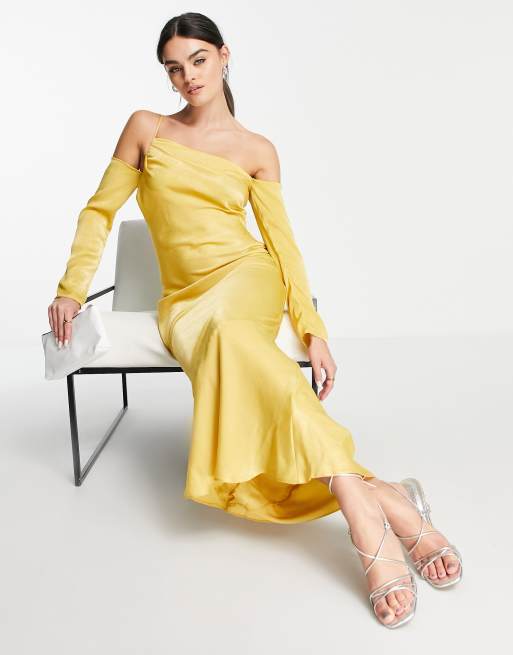 ASOS DESIGN – Guldfärgad asymmetrisk maxiklänning i satin med bara axlar