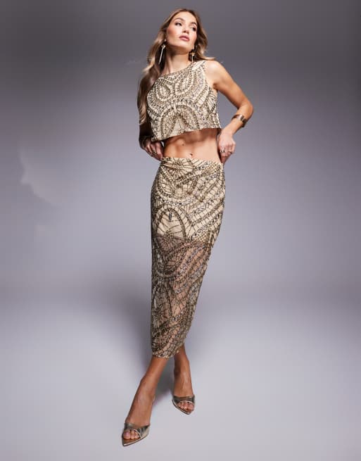 ASOS DESIGN – Guldfärgad, utsmyckad midikjol, del av set