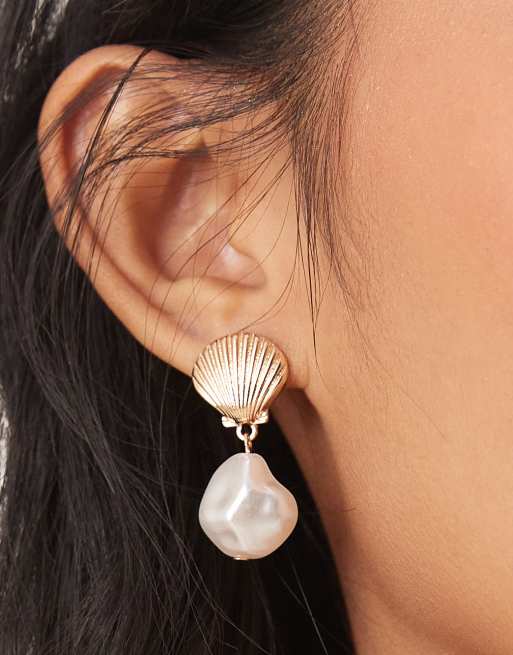 ASOS DESIGN – Guldfärgade stiftörhängen med snäckdesign och fuskpärlor