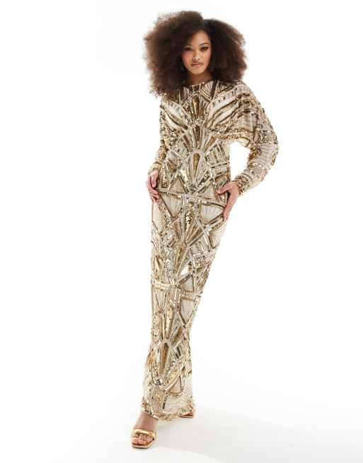 ASOS DESIGN – Guldig, utsmyckad maxiklänning med ergonomisk design och pingvinärmar