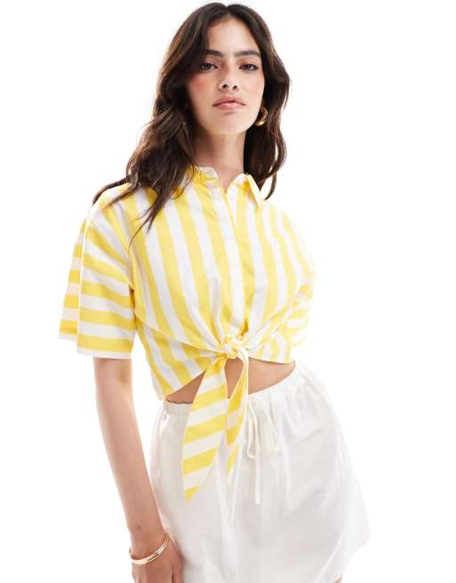 ASOS DESIGN – Gulrandig, kort skjorta med korta ärmar och knytning i midjan