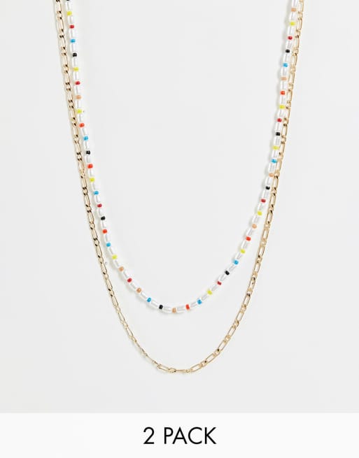 ASOS DESIGN – Halsband med pärlor i regnbågsdesign och kedja, 2-pack