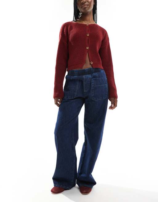ASOS DESIGN – Indigoblå jeans i dra på-modell med påsydda fickor