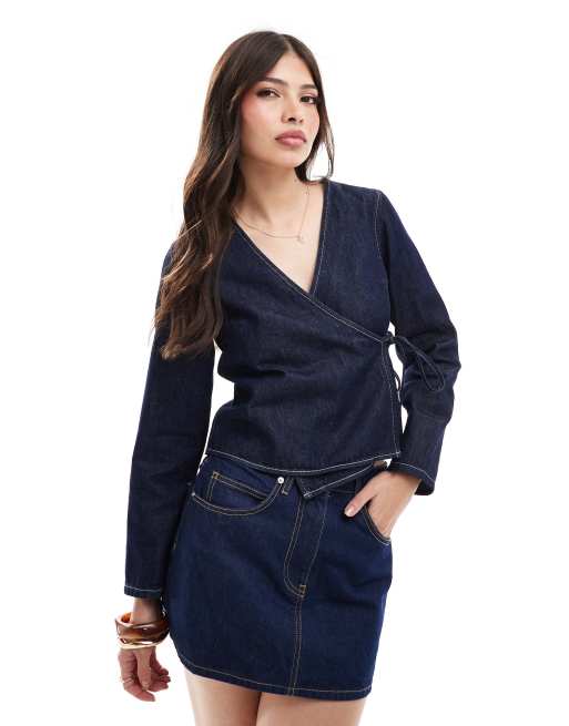 ASOS DESIGN – Indigoblå, långärmad omlottopp i denim