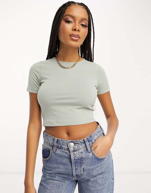 ASOS DESIGN – Kakifärgad figursydd t-shirt med kort design