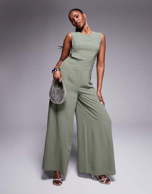 ASOS DESIGN – Kakifärgad jumpsuit med vida ben och spänne