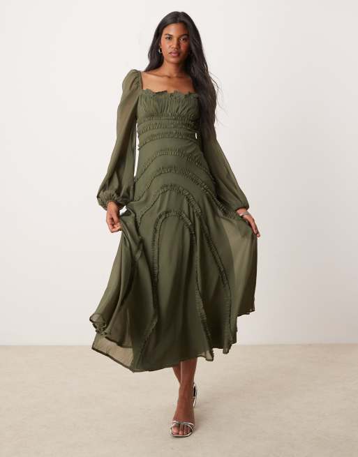 ASOS DESIGN – Kakifärgad, långärmad midiklänning i chiffong med volang