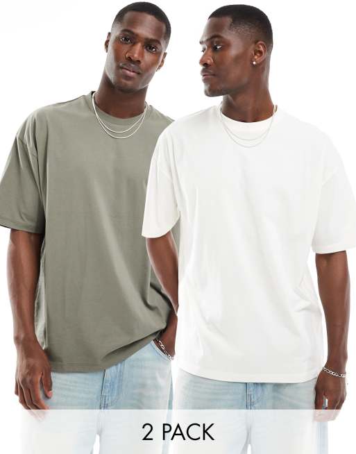 ASOS DESIGN – Kakifärgad och gräddvit, kraftig t-shirt i oversize, 2-pack