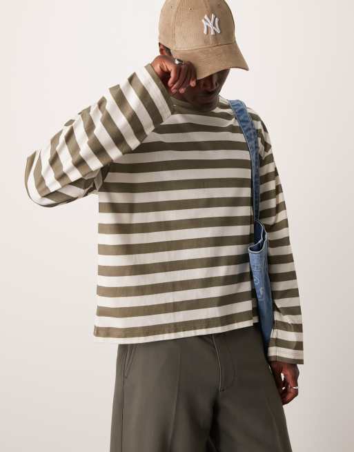 ASOS DESIGN – Kakifärgad och vitrandig t-shirt med långa ärmar och boxig oversize passform