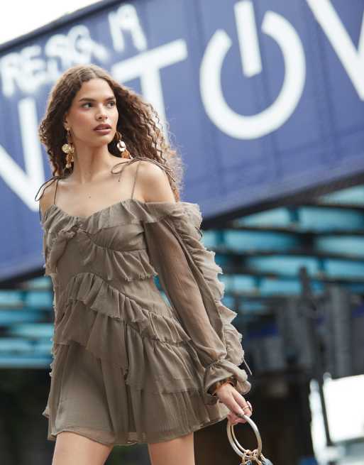ASOS DESIGN – Kakifärgad, panelsydd miniklänning i off shoulder-design med volang