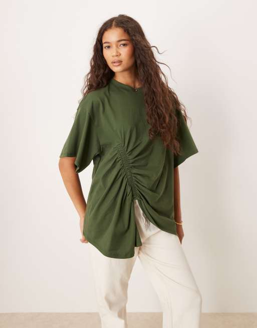 ASOS DESIGN – Kakifärgad t-shirt i oversize med ryschad, draperad fåll