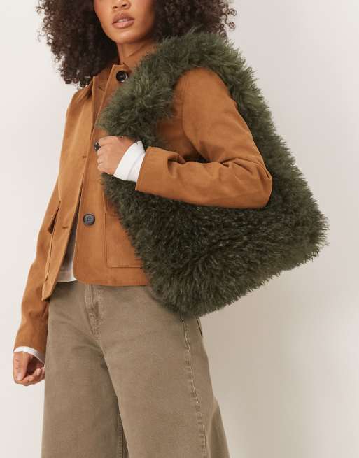ASOS DESIGN – Kakifärgad toteväska i lockig fuskpäls