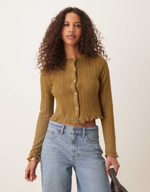 ASOS DESIGN – Kakifärgad, virkad kofta med volangfåll
