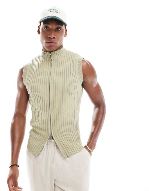ASOS DESIGN – Kakigrönt, ribbstickat, ärmlös väst i muscle fit med dragkedja