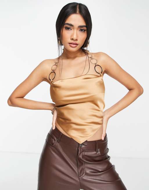 ASOS DESIGN – Kamelbrun scarf-topp i satin med halterneck och ringar