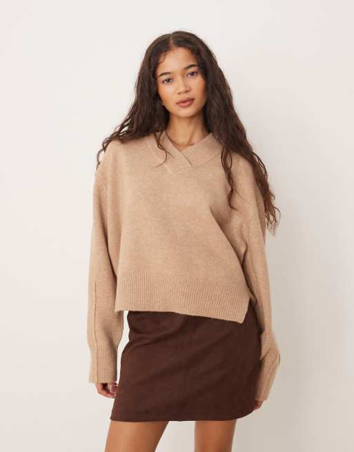 ASOS DESIGN – Kamelbrun tröja med v-ringning, boxig passform och sidoslits
