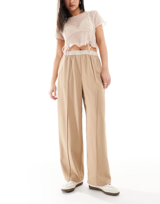 ASOS DESIGN – Kamelfärgade, ankellånga byxor med kontrasterande, elastisk midja