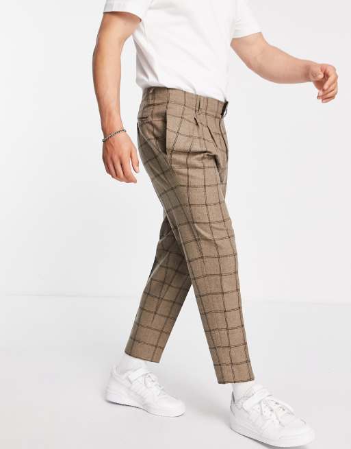 ASOS DESIGN – Kamelfärgade rutiga finbyxor i ylleblandning med avsmalnande kort passform
