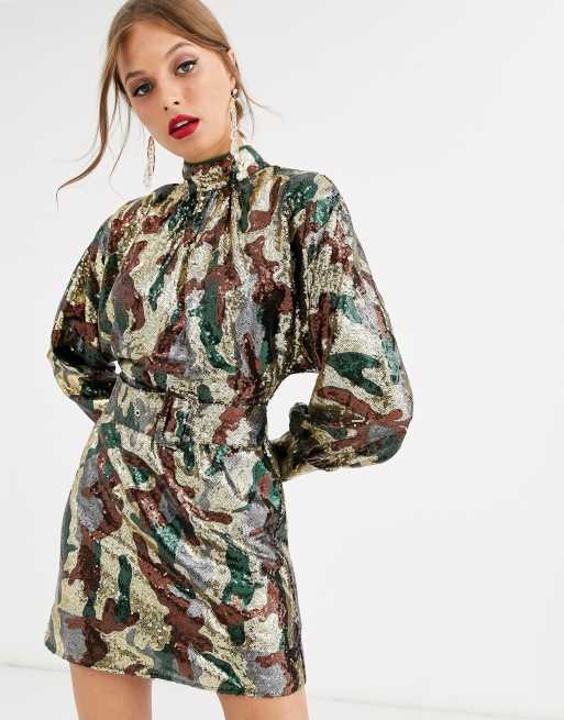 ASOS DESIGN – Kamoflagemönstrad miniklänning i slouchy passform med paljetter och skärp