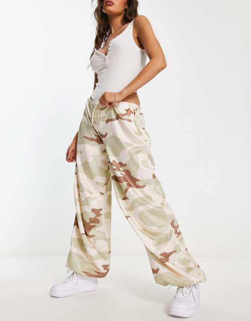 ASOS DESIGN – Kamouflagemönstrade fallskärmsbyxor i satin