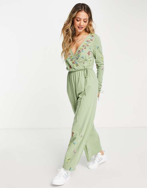 ASOS DESIGN – Khakifärgad broderad jumpsuit med omlottdesign och ryschade ärmar