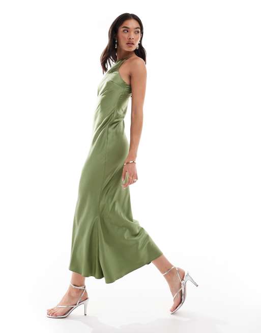 ASOS DESIGN – Khakifärgad, diagonalskuren maxiklänning i satin med brottarringning