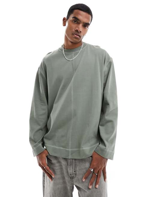 ASOS DESIGN – Khakifärgad oversize t-shirt i kraftigt material med långa ärmar och dekorativ söm