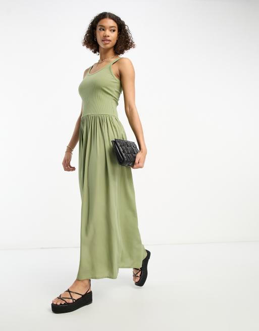 ASOS DESIGN – Khakifärgad ribbad midiklänning med djup halsringning och sänkt midja