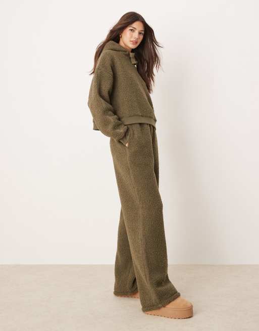 ASOS DESIGN – Khakifärgat mysset i teddy med kort huvtröja och vida byxor