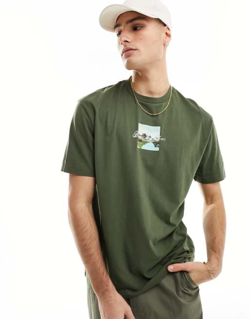 ASOS DESIGN – Khakigrön, avslappnad t-shirt med naturtryck framtill