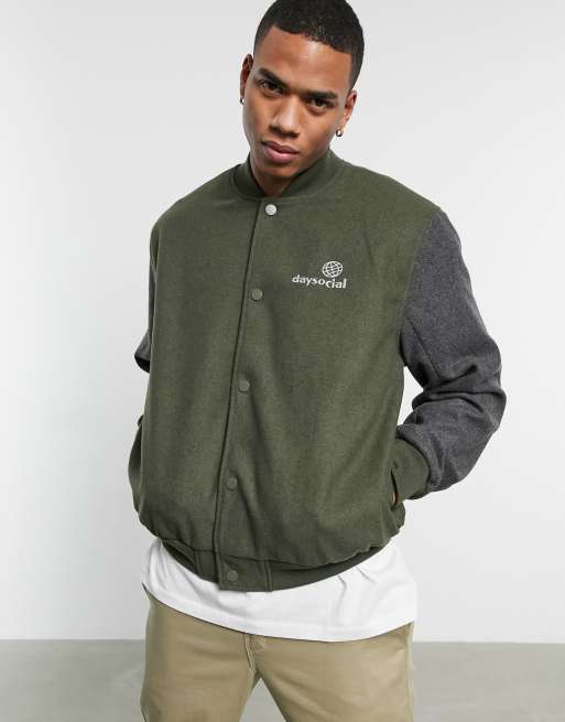 ASOS DESIGN – Khakigrön collegejacka i oversize med kontrastfärgade grå ärmar