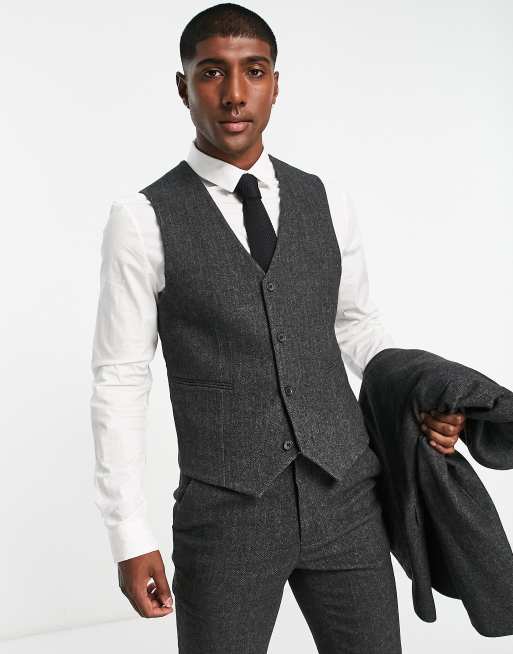 ASOS DESIGN – Kolgrå fiskbensmönstrad kostymväst med extra skinny passform av ylletyg, del av kostym