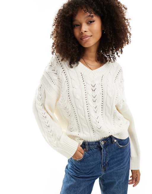 ASOS DESIGN – Krämvit kabelstickad tröja med v-ringning