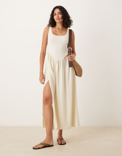 ASOS DESIGN – Krämvit, strukturerad midiklänning med krinklat liv och vid ringning