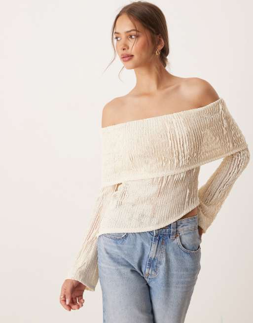 ASOS DESIGN – Krämvit, virkad, halvskir bardot-topp med asymmetrisk fåll