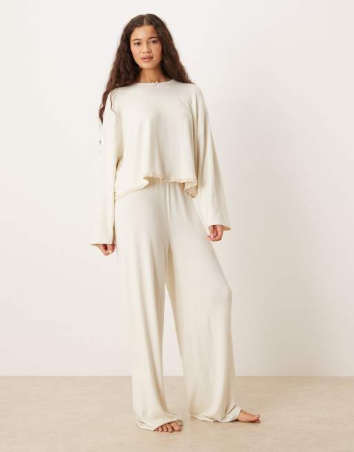 ASOS DESIGN – Krämvita, mjuka pyjamasbyxor med vida ben och blomkant i jersey