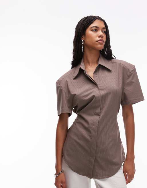 ASOS DESIGN – Kritstrecksrandig skjorta med korta ärmar, axelvaddar och indragen detalj