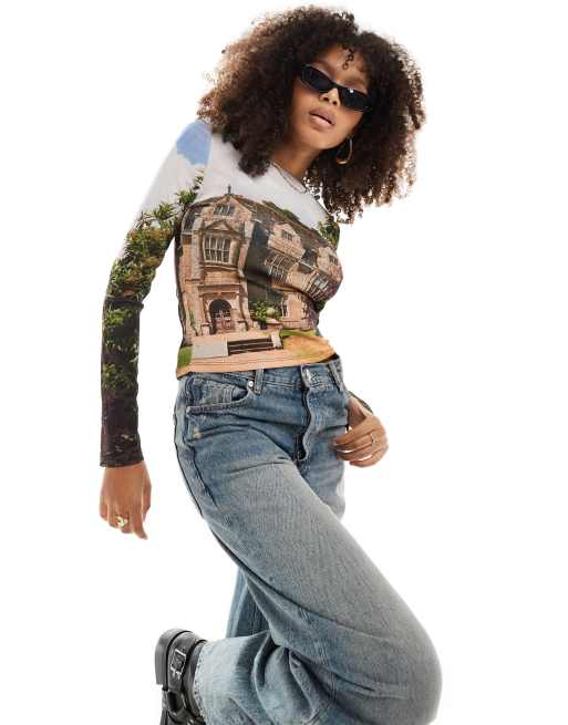 ASOS DESIGN – Långärmad t-shirt i mesh med herrgårdstryck