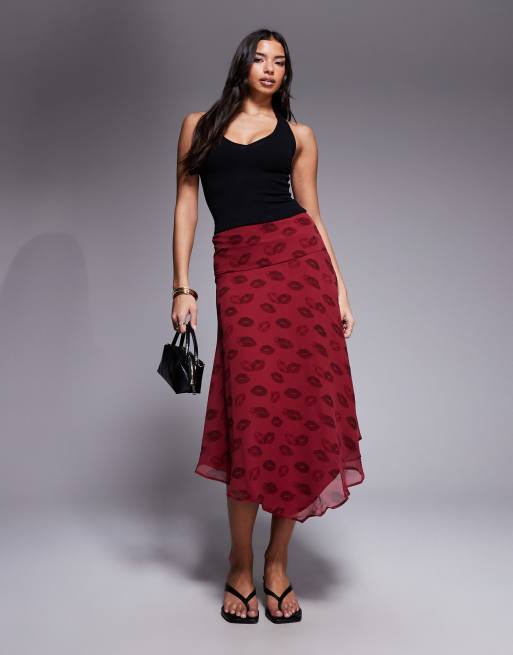 ASOS DESIGN – Läppstiftsmönstrad midikjol i chiffong med ojämn fåll, del av set