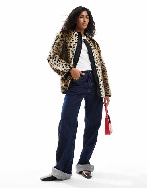 ASOS DESIGN – Leopardmönstrad jacka i fuskpäls utan krage