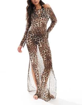 ASOS DESIGN – Leopardmönstrad strandklänning av mesh i maxilängd med långa ärmar
