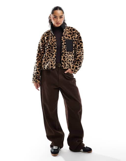 ASOS DESIGN – Leopardmönstrad sweatshirt i teddyfleece med dragkedja och quiltad ficka