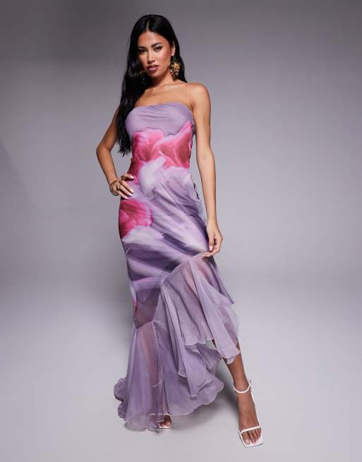 ASOS DESIGN – Lila, abstrakt mönstrad maxiklänning med bandeau-ringning och volangfåll