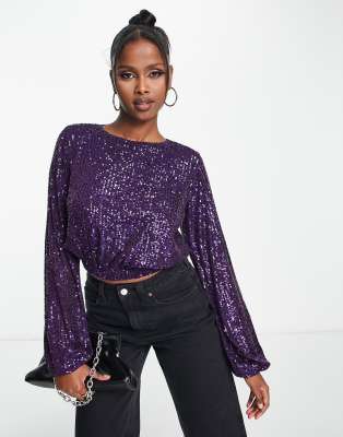 ASOS DESIGN – Lila blus med ballongärmar och paljetter
